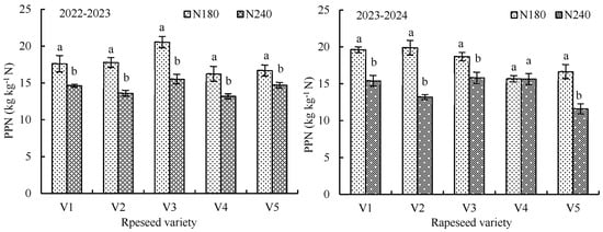 For the rapeseed varieties V1, V2, V3, V4, and V5, the PPN was significantly higher under the N180 treatment than that under the N240 treatment in the trial conducted in 2022–2023, and so was the PPN of these rapeseed varieties (excepting the V4) in the trial conducted in 2023–2024 (Figure 1). The PPN showed a decreasing trend with the increase in the N-app level.