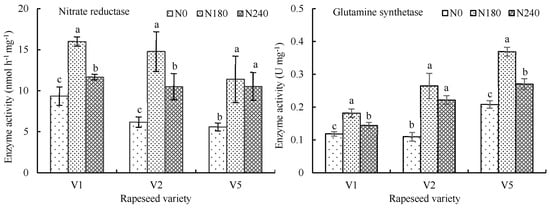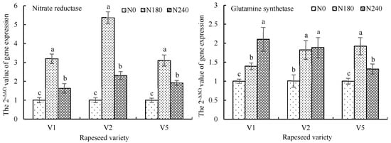 Compared to the N0 treatment, the N180 and N240 treatment induced a significant increase in the gene expression levels of NR and GS in leaves of the rapeseed varieties tested. The NR gene expression level in leaves of the V1, V2, and V5 varieties achieved peak values under the N180 treatment (Figure 3). The GS gene expression level in leaves of variety V1 was increased with N-app increasing from 0 to 180 and 240 kg ha−1, which for variety V5 was increased and achieved a peak value at 180 kg ha−1 N-app, but for the V2 variety showed no significant difference under the N180 and N240 treatments (Figure 3). Thus, N-app induced a significant increase in gene expression level of NR and GS in leaves of rapeseed; with N-app increasing from a middle level to a higher level NR gene expression level declined, but GS gene expression showed inconsistent changes in different rapeseed varieties.
