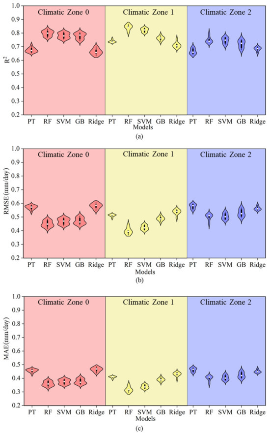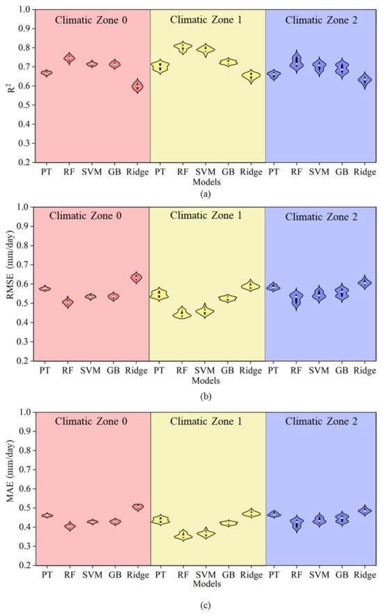 Figure 3 presents a comparison of the simulation accuracy between the PT empirical equation and several machine learning models (RF, SVR, GB, and Ridge) under Strategy 1 across three climatic zones. Overall, the PT model showed significant disadvantages in all climatic zones, with an average R2 of only 0.68, an RMSE of 0.57 mm/day, and an MAE of 0.45 mm/day. Compared to the RF, SVM, and GB machine learning models, the PT model’s R2 was lower by 0.09, and its RMSE and MAE were higher by 0.09 and 0.07, respectively. However, it was only 0.003 lower in R2 than the Ridge model, and both the RMSE and MAE were higher by 0.002 mm/day. This indicates that the relationship between ET0 and meteorological data is nonlinear, and the PT formula has weak nonlinear response capability, making it less suitable for estimation across multiple climatic conditions. From the perspective of climatic zone differences, the average R2 values of all models were higher in Climatic Zone 0, with the RF model performing the best, reaching an average R2 of 0.80. The accuracy of the SVM and GB models was slightly lower, while the Ridge model had the lowest accuracy with an R2 of 0.66. In Climatic Zones 1 and 2, the performance of all models slightly decreased, but the simulation accuracy of the machine learning methods still outperformed that of the PT model. It is evident that machine learning models offered superior error control, with the RF and SVM models consistently showing lower average errors across all climatic zones. Therefore, compared to the PT equation, the machine learning models demonstrated stronger fitting ability and stability across multiple climatic regions.