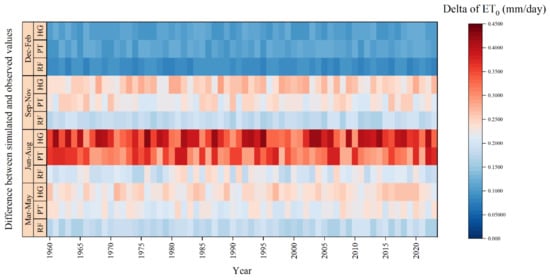 Figure 7 illustrates the dynamic variation in the differences between various ET0 estimation methods (RF, PT, and HG) and the standard values across different seasons from 1960 to 2023. Overall, the RF model showed smaller estimation deviations throughout the year compared to the PT and HG equations. The average annual deviation of ET0 estimated by the RF model was reduced by 0.057 mm/day and 0.076 mm/day compared to that of the PT and HG models, respectively, demonstrating better accuracy and stability. From a seasonal perspective, the period from June to August showed the most significant differences, with the annual average differences between the PT and HG models and the standard values being 0.328 mm/day and 0.366 mm/day, respectively. In contrast, the RF model significantly reduced the estimation bias during this season to 0.207 mm/day, decreasing by 0.121 mm/day and 0.159 mm/day compared to that of the PT and HG models, respectively. This highlights the RF model’s significant optimization ability for ET0 estimation during the peak evapotranspiration season with high temperatures. Conversely, during the winter months from December to February, the differences between the models and the standard values were the smallest. The annual average differences for RF, PT, and HG were 0.090 mm/day, 0.111 mm/day, and 0.108 mm/day, respectively, indicating that the ET0 variation was smaller in winter, and all models maintained high consistency.