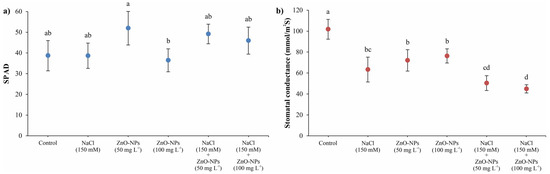 Effects of ZnO nanoparticles on (a) SPAD value and (b) stomatal conductance of coffee seedlings in the presence/absence of NaCl (150 mM). The standard deviation (±SD) is shown by the error bars. Significant differences (p ≤ 0.05) between treatments are indicated by different letters above these bars.