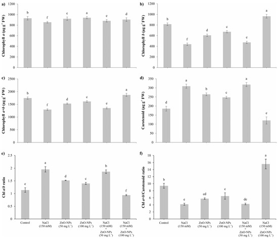 Effects of ZnO nanoparticles on photosynthetic pigments of coffee seedlings in the presence/absence of NaCl (150 mM). (a) Chlorophyll a, (b) Chlorophyll b, (c) Chlorophyll a+b, (d) Carotenoid, (e) Chl a/b ratio, and (f) Chl a+b/Carotenoid ratio. The standard deviation (±SD) is shown by the error bars. Significant differences (p ≤ 0.05) between treatments are indicated by different letters above these bars.