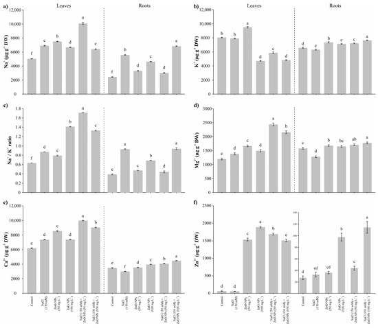 Effects of ZnO nanoparticles on the content of (a) Na+, (b) K+, (c) Na+/K+ ratio, (d) Mg2+, (e) Ca2+, and (f) Zn2+ in leaves and roots of coffee seedlings under conditions of presence/absence of NaCl (150 mM). The standard deviation (±SD) is shown by the error bars. Significant differences (p ≤ 0.05) between treatments are indicated by different letters above these bars.
