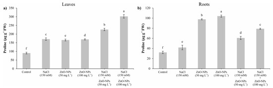 Effects of ZnO nanoparticles on proline of coffee seedlings in the presence/absence of NaCl (150 mM). (a) Leaves and (b) roots. The standard deviation (±SD) is shown by the error bars. Significant differences (p ≤ 0.05) between treatments are indicated by different letters above these bars.