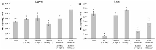 Effects of ZnO nanoparticles on MDA content of coffee seedlings in the presence/absence of NaCl (150 mM). (a) Leaves and (b) roots. The standard deviation (±SD) is shown by the error bars. Significant differences (p ≤ 0.05) between treatments are indicated by different letters above these bars.