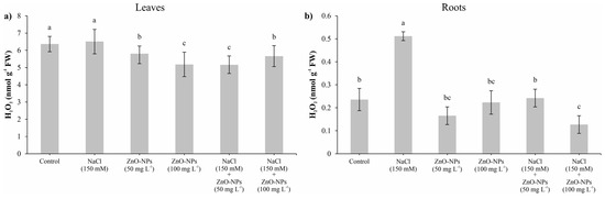 Effects of ZnO nanoparticles on H2O2 content of coffee seedlings in the presence/absence of NaCl (150 mM). (a) Leaves and (b) roots. The standard deviation (±SD) is shown by the error bars. Significant differences (p ≤ 0.05) between treatments are indicated by different letters above these bars.