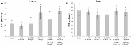 Effects of ZnO nanoparticles on CAT activity of coffee seedlings in the presence/absence of NaCl (150 mM). (a) Leaves and (b) roots. The standard deviation (±SD) is shown by the error bars. Significant differences (p ≤ 0.05) between treatments are indicated by different letters above these bars.