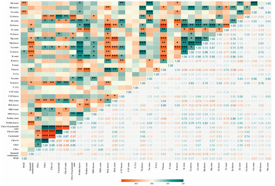 Pearson’s correlation between the physiological and nutritional parameters evaluated in the experiment. The evaluated variables include the following: SPAD: chlorophyll index, Chl a: chlorophyll a, Chl b: chlorophyll b, Chl a+b: total chlorophyll, Chl a/b: chlorophyll a to chlorophyll b ratio, MDA: malondialdehyde, H2O2: hydrogen peroxide, CAT: catalase activity, Na: sodium, C: carbon, N: nitrogen, P: phosphorus, K: potassium, Mg: magnesium, Ca: calcium, Zn: zinc, Fe: iron, Cu: copper, Mn: manganese. *, p < 0.05; **, p < 0.01; ***, p < 0.001.