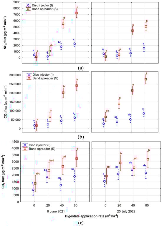Flux values of measured gases, (a) ammonia, (b) carbon dioxide, and (c) methane, for different methods and rates of digestate application at two measurement dates; vertical bars denote 0.95 confidence intervals; lower case letters denote significant differences within each measurement date separately.