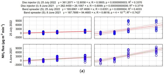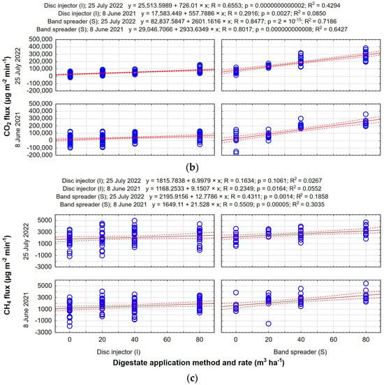 Linear regression analysis of flux values of measured gases, (a) ammonia, (b) carbon dioxide, and (c) methane, on digestate application rates for different methods of digestate application during the experimental years; dotted regression bands denote confidence at 0.95 level.