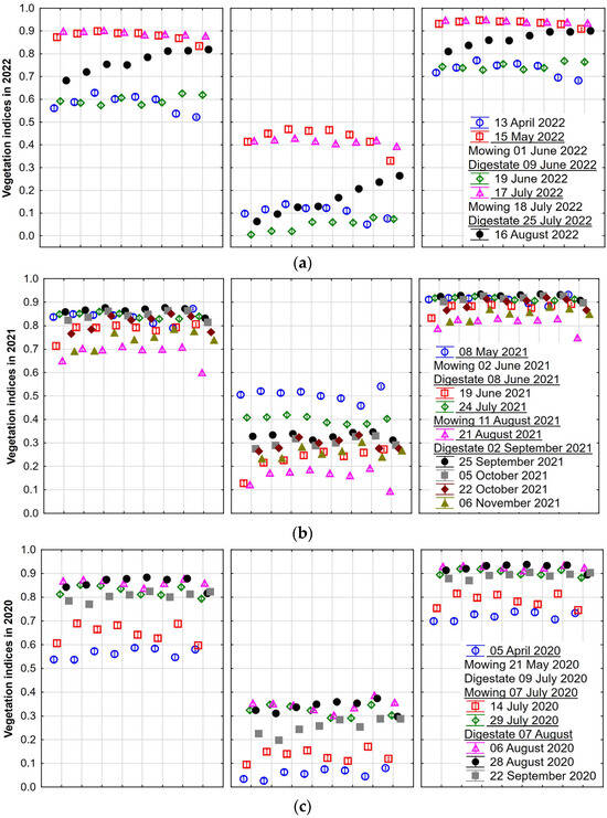 Statistical analysis of data was performed using Statistica 14 software (TIBCO, Palo Alto, CA, USA). Significant differences in fluxes (factors: date; digestate rate; application method), vegetation indices (factors: vegetation index type; date; variant), and quantitative and qualitative harvest parameters (factors: year; cutting; variant) were determined through factorial analyses of variance (ANOVA) and Tukey’s HSD post-hoc tests with a 95% confidence interval. Simple linear regression for gas fluxes and for quantitative and qualitative harvest parameters was performed in order to analyze their dependence on the digestate application rate.