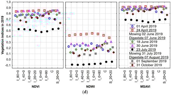 NDVI, NDWI, and MSAVI indices of individual variants (digestate rate and application method) during experimental years: (a) 2022, (b) 2021, (c) 2020, (d) 2019; vertical bars denote 0.95 confidence intervals.