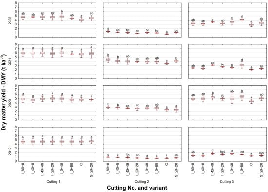 Dry matter yield (DMY) means after the three permanent grassland cuttings of individual variants during the four experimental years; boxes denote standard error, and vertical bars denote two standard deviations; lower case letters denote significant differences within each year and cutting separately.