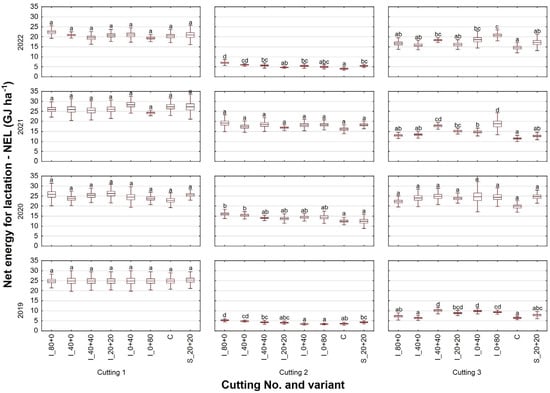 Net energy for lactation (NEL) means after the three permanent grassland cuttings of individual variants during the four experimental years; boxes denote standard error, and vertical bars denote two standard deviations; lower case letters denote significant differences within each year and cutting separately.