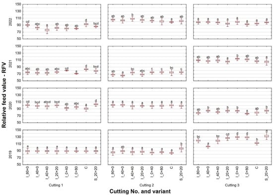 Relative feed value (RFV) means after the three permanent grassland cuttings of individual variants during the four experimental years; boxes denote standard error, and vertical bars denote two standard deviations; lower case letters denote significant differences within each year and cutting separately.