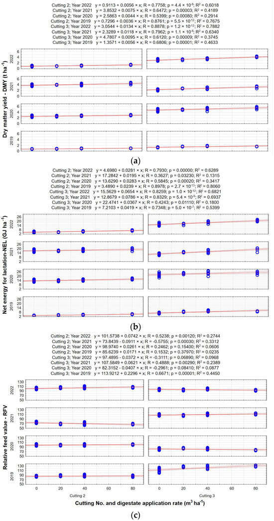 Linear regression analysis of (a) dry matter yield (DMY), (b) net energy for lactation (NEL), and (c) relative feed value (RFV) of the 2nd and 3rd permanent grassland cutting on the respective digestate application rates for disc injector (I) method of digestate application during the experimental years; dotted regression bands denote confidence at 0.95 level.