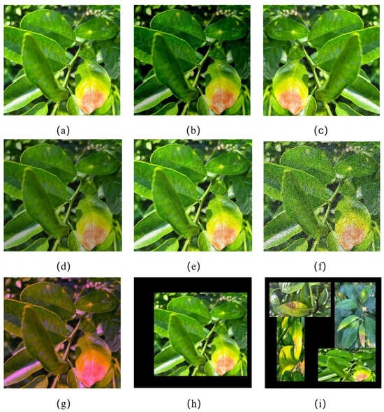 To enhance the generalization ability of the citrus pest and disease detection model, reduce its reliance on specific data features, and improve its adaptability to complex environments and diverse targets, a systematic data augmentation process was applied to the dataset in this study. Data augmentation involves applying various transformations to the original images to increase the diversity of training samples, effectively mitigating overfitting and improving the model’s robustness in real-world scenarios. A total of eight augmentation techniques were used to expand the dataset, including: random lighting adjustment [], horizontal flipping, contrast variation [], Gaussian noise [], salt-and-pepper noise [], saturation adjustment [], random scaling, and mosaic augmentation.