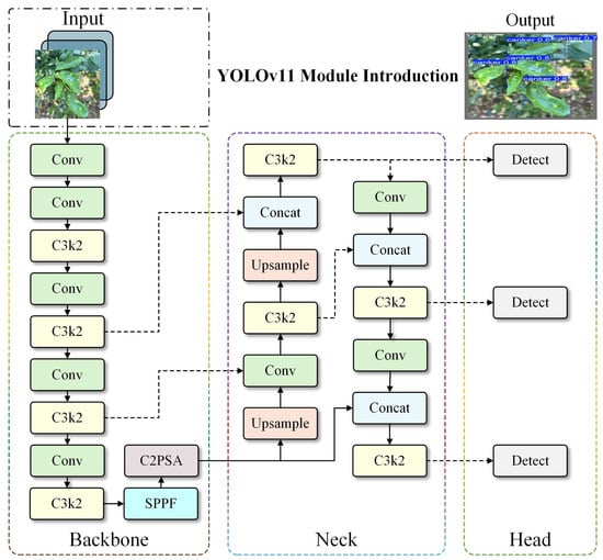 YOLOv11 is the latest generation of object detection algorithms developed by Ultralytics. Building upon previous versions of the YOLO series, it introduces substantial improvements in both network architecture and training methodology, significantly enhancing detection speed, accuracy, and efficiency []. In addition to traditional object detection, YOLOv11 extends its functionality to a variety of computer vision tasks, including instance segmentation, pose estimation, oriented object detection, image classification, and object tracking. As illustrated in Figure 3, YOLOv11 adopts an improved backbone and neck design that greatly enhances feature extraction capabilities. The backbone utilizes a series of convolutional and deconvolutional layers, combined with residual connections and bottleneck structures, to reduce model complexity while maintaining strong performance. The neck, situated between the backbone and head, is responsible for feature fusion and enhancement, further boosting detection capability. Furthermore, YOLOv11 introduces new feature extraction modules such as C3K2 and C2PSA. The C3K2 module replaces the C2f module in YOLOv8 by using two small convolutional kernels (kernel size 2) instead of a single large kernel, improving computational efficiency while preserving feature representation. The C2PSA module incorporates a spatial attention mechanism that enhances the model’s focus on key regions, significantly improving the detection of small and overlapping objects. By refining the model’s ability to selectively attend to regions of interest, YOLOv11 outperforms previous versions in scenarios requiring fine-grained object recognition. It also retains the SPPF module from YOLOv8 to facilitate multi-scale feature fusion and further optimize inference speed. With a refined architecture and optimized training strategy, YOLOv11 achieves a better balance between speed and accuracy, demonstrating higher mean Average Precision (mAP) on the COCO dataset, faster inference, and fewer parameters compared to earlier versions. Owing to the incorporation of the C2PSA module, its performance on small and densely packed targets is notably enhanced []. With robust cross-environment adaptability and support for diverse vision tasks, YOLOv11 proves to be a powerful tool for real-time computer vision applications across mobile and cloud-based platforms. Therefore, it was selected as the baseline model in this study.