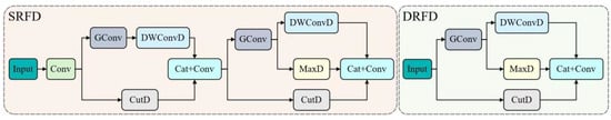 Robust Feature Downsampling (RFD) is a novel and general-purpose downsampling module []. It has two variants: Shallow RFD (SRFD) and Deep RFD (DRFD), designed to optimize different stages of feature extraction and enhance feature robustness. Compared to conventional downsampling modules, RFD integrates multi-path downsampling features to improve the representational capability of feature maps while minimizing information loss. Figure 4 shows RFD’s framework utilizing three distinct downsampling methods: convolutional, slicing-based, and max pooling. Each of these techniques offers unique characteristics and advantages, collectively contributing to the powerful performance of the RFD module.