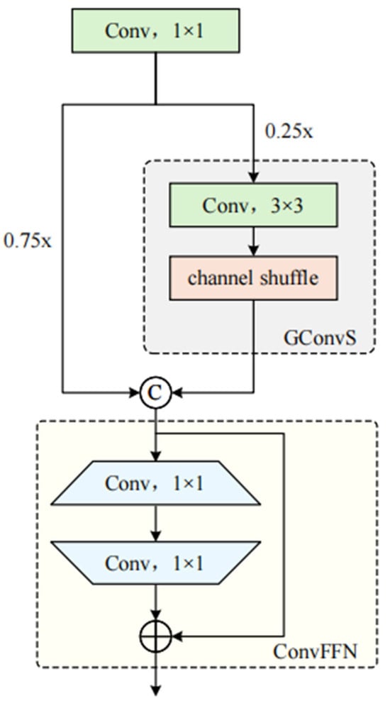 To improve the accuracy and efficiency of object detection, researchers have continuously explored new network architectures and algorithms. The Dynamic Group Shuffle Transformer (DGST) was proposed under this background as an innovative technique []. As shown in Figure 6, the DGST module combines the ideas of Dynamic Group Convolution and Shuffle Transformer. Dynamic Group Convolution is a flexible convolutional operation that can dynamically adjust the grouping strategy according to the characteristics of the input data. Moreover, it can automatically adjust the number of groups based on task complexity, thus balancing computational cost and model performance. The Shuffle Transformer is an improved algorithm based on the Transformer architecture. It enhances the model’s generalization capability by applying a shuffle operation to the input sequence, enabling the model to better learn the intrinsic structure of the input data. The core concept of the DGST module adopts a 3:1 partition strategy, in which one-third of the module performs group convolution and channel shuffle operations. By replacing the fully connected layer with convolutional operations to achieve similar functionality, the original neck module is substituted. This design not only reduces computational requirements but also aligns better with the characteristics of convolutional neural networks, potentially offering superior performance for the model. By integrating the concepts of dynamic group convolution and shuffle transformation, DGST enhances the model’s feature extraction and representation capabilities, improving the accuracy and efficiency of object detection. At the same time, this design reduces computational demand and model size, providing better overall performance. The DGST module integrates the concepts of dynamic group convolution and the Shuffle Transformer. Unlike the static group convolutions used in ShuffleNet or MobileNet, DGST employs a dynamic allocation strategy, allowing the grouping structure to adapt to task variations, while the shuffle mechanism enhances cross-group information flow. Although this idea is inspired by lightweight network designs in [], we are the first to introduce it into the YOLOv11 architecture and tailor it specifically for object detection through structural pruning and lightweight optimization. This enhancement improves the representation capability for small-object detection while maintaining model efficiency. To our knowledge, this design has not yet been applied in agricultural pest and disease detection scenarios.