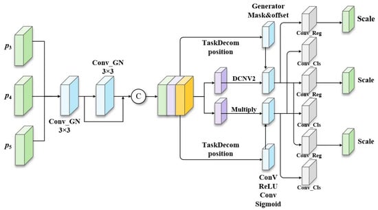 The Task Align Dynamic Detection Head (TADDH) is an innovative technique in the field of computer vision and deep learning that has demonstrated significant advantages in object detection tasks []. It was proposed to address the inconsistency between the localization and classification tasks, which are often handled independently in conventional object detection models. Such separation can result in accurate localization but incorrect classification, or vice versa. The TADDH dynamically aligns these two tasks to improve the overall performance of the model. As illustrated in Figure 7, the TADDH employs shared convolutional layers to substantially reduce the number of parameters, making the model lighter and more suitable for deployment on resource-constrained devices. To accommodate the varying object scales targeted by different detection heads, it introduces a scale adjustment layer that adapts the resolution of the feature maps. An interactive feature learner, utilizing multiple convolutional layers, extracts and amalgamates representations for intertask interactions. In the localization branch, the TADDH integrates these interactive features with DCNv2 (Deformable Convolutional Network v2) to generate the necessary offsets and modulation masks for deformable sampling. In the classification branch, the interactive features enable dynamic feature selection. DCNv2 enhances standard deformable convolution with multi-level offset learning, enabling flexible sampling across multi-scale feature maps. Its modulation mechanism dynamically adjusts sampling positions and intensities, improving the network’s adaptability. By promoting effective interaction between the localization and classification branches, TADDH enhances both tasks’ precision and robustness, thereby significantly improving detection accuracy.