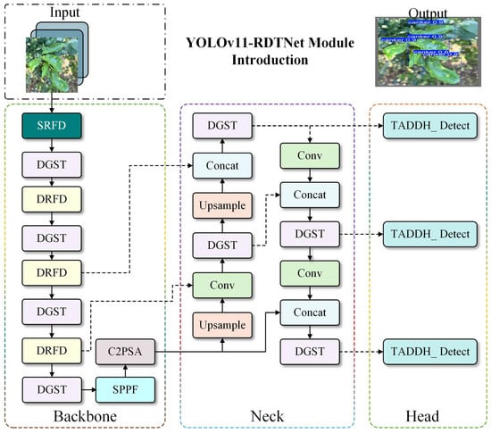 This study introduces the YOLOv11-RDTNet, a streamlined and effective citrus pest and illness identification system derived from the YOLOv11 framework. In the backbone, the model integrates shallow and deep Robust Feature Downsampling (SRFD and DRFD) modules. Additionally, the original C3k2 modules in both the backbone and neck are replaced with a Dynamic Grouping and Shuffling Transformer (DGST) module. Finally, a Task-Aligned Dynamic Detection Head (TADDH) is employed in place of the original detection head. As depicted in Figure 9, the YOLOv11-RDTNet model consists of five main components: input, backbone, neck, head, and output.