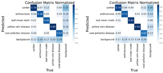 Figure 11 shows the predictions of the original YOLOv11 model and the improved YOLOv11-RDTNet model across five categories. It can be seen that the detection accuracy for small targets such as anthracnose, leaf miner moth, and yellow vein disease significantly improved, with a slight improvement on the canker label, and an ambiguous result for coal pollution disease. This validated the feasibility and superiority of the improved model. To enhance the accuracy of Figure 11, this study imposed strict requirements on the clarity of the dataset. During the data collection process, the camera lens was first cleaned using lens cleaning tissue, and images were captured under well-lit conditions. To ensure precise camera focus, the device was kept stable during shooting, avoiding any unnecessary movement to improve image quality. These measures effectively minimized measurement errors caused by lighting inconsistencies, lens contamination, or motion during image acquisition.