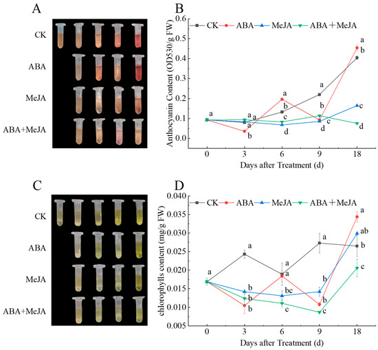 With prolonged treatment time, the anthocyanin content in the peels of both the CK group and phytohormone alone treatment groups gradually increased. Compared to CK, ABA treatment significantly promoted anthocyanin accumulation, whereas MeJA and ABA + MeJA treatments markedly inhibited this process. At 18 days post-treatment, anthocyanin content in the ABA-treated group increased by 12.34% compared to the CK, while MeJA and ABA + MeJA treatments reduced anthocyanin levels by 59.31% and 81.42%, respectively (Figure 2A,B). Chlorophyll content also affects the color of the fruit; the chlorophyll content of the CK group exhibited a gradual increase over time. In contrast, the ABA and MeJA alone treatment groups showed no significant chlorophyll accumulation from 0 to 9 days, but displayed rapid accumulation from 9 to 18 days, ultimately exceeding CK levels. Conversely, the ABA + MeJA treatment group showed a decline in chlorophyll content from 0 to 9 days, followed by accumulation from 9 to 18 days, though its overall levels remained lower than those of the CK (Figure 2C,D). Overall, ABA treatment promoted the accumulation of both anthocyanins and chlorophyll in pear fruits, while MeJA treatment inhibited anthocyanin accumulation with minimal impact on chlorophyll content. In contrast, the ABA + MeJA combined treatment exhibited inhibitory effects on both pigments.