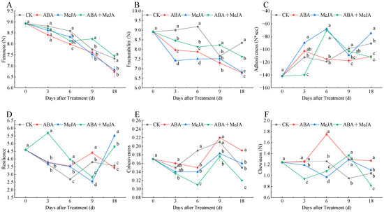 Changes in texture of pears under different treatments. The firmness (A), fracturability (B), adhesiveness (C), resilience (D), cohesiveness (E) and chewiness (F) of ‘Red Zaosu’ pear fruits. All the data represent the means ± SD of three biological replicates. Different letters indicate values are significantly different (p < 0.05).