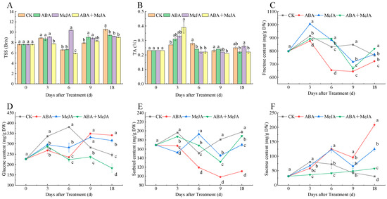 The TSS content in the CK, ABA alone treatment group and ABA + MeJA treatment groups exhibited a trend of initial decrease followed by increase, whereas the MeJA alone treatment group showed an opposite trend, with TSS accumulation peaking on day 6. On day 18 after treatment, the TSS content in the ABA, MeJA and ABA + MeJA treatment groups decreased by 10.79%, 12.96% and 14.85%, respectively, compared to the CK. Therefore, all three phytohormone treatments significantly inhibited TSS accumulation (Figure 4A). The TA content in pear fruits peaked on day 3, then gradually decreased. Compared to the CK, both ABA and ABA + MeJA treatments significantly accelerated TA reduction, whereas MeJA alone showed minimal impact on TA degradation (Figure 4B).