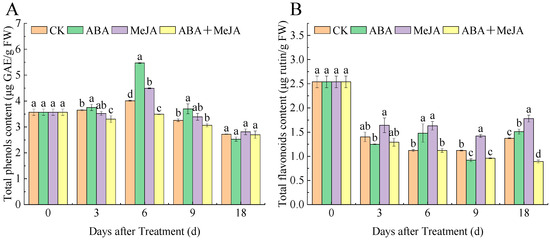The total phenolic content of pear fruits gradually accumulated from 0 to 6 days after treatment, followed by a gradual decline. The ABA alone treatment group exhibited a significantly higher total phenol content than the CK from 3 to 9 days, indicating that ABA alone could markedly promote total phenol accumulation in pear fruits. The promotion effect of MeJA treatment alone is relatively weak. In contrast, the ABA + MeJA combination treatment significantly suppressed total phenol accumulation, maintaining levels below the CK throughout the post-treatment period (Figure 5A). The total flavonoid content in pear fruits from both the CK and single phytohormone treatment groups exhibited an initial increase followed by a decrease during the post-treatment period. On day 18 after treatment, the total flavonoid content in the ABA and MeJA treatment groups increased by 10.22% and 29.93%, respectively, compared to the CK, indicating that individual treatments with these phytohormones promoted total flavonoid accumulation. In contrast, the ABA + MeJA combined treatment group showed significantly lower flavonoid levels from 9 to 18 days compared to the CK, suggesting that the combination treatment suppressed flavonoid accumulation (Figure 5B). The results that individual treatments of ABA and MeJA promote flavonoid accumulation align with findings by Mattus-Araya, Elena et al. [30] and Wang, K. et al. [31], whereas the combined ABA + MeJA treatment induced an antagonistic effect, indicating that this treatment impedes changes in secondary metabolites during postharvest fruit ripening.