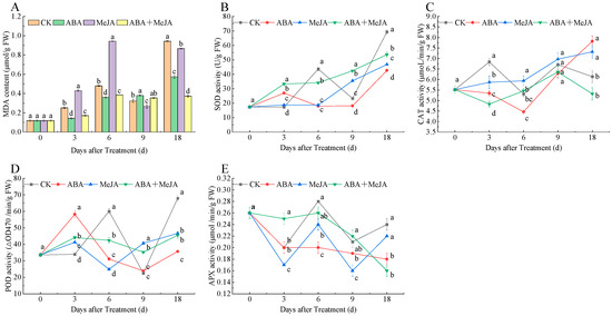 Antioxidant capacity of pears under different treatments. The MDA contents (A) and SOD (B), CAT (C), POD (D) and APX (E) activity of ‘Red Zaosu’ pear fruits. All the data represent the means ± SD of three biological replicates. Different letters indicate values are significantly different (p < 0.05).