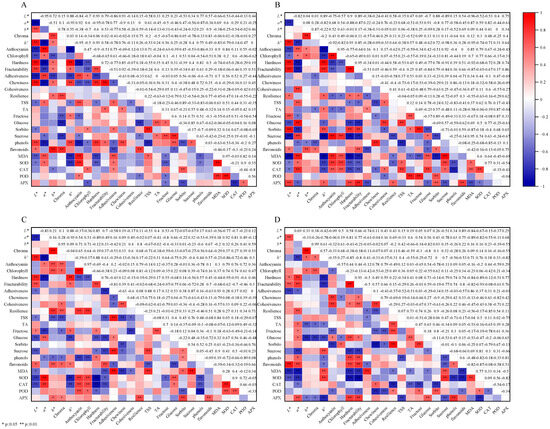 Pearson correlation analysis of different treatments. CK (A), ABA (B), MeJA (C) and ABA + MeJA (D) treatment groups. * significant differences at 0.05 level; ** significant differences at 0.01 level.