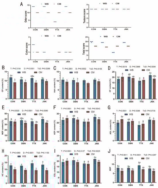 (A) The organoleptic properties total score (each point represents three independent replicates of co-silage bags (n = 3) and the chemical composition biodegradation potential of the peanut vine co-silage with wheat bran or corn meal on DM basis, respectively (B–J). DM: dry matter; (B) CP: crude protein; (C) Ash; (D) CF: crude fiber; (E) NDF: neutral detergent fiber; (F) ADF: acid detergent fiber; (G) ADL: acid detergent lignin; (H) HC: Hemicellulose; (I) CEL: Cellulose; (J) BDP: biodegradation potential, WB: wheat bran; CM: corn meal. T: the influence of inoculant; D: the influence of silage substrate; T × D: the interaction between the inoculant and silage substrate. The significant difference (p < 0.05) between the different inoculant treatments on the same silage raw substrate is represented by the different capital letters (A–C). The significant difference (p < 0.05) between the different silage raw substrates on the same inoculant treatment is represented by the different lowercase letters (a–b).