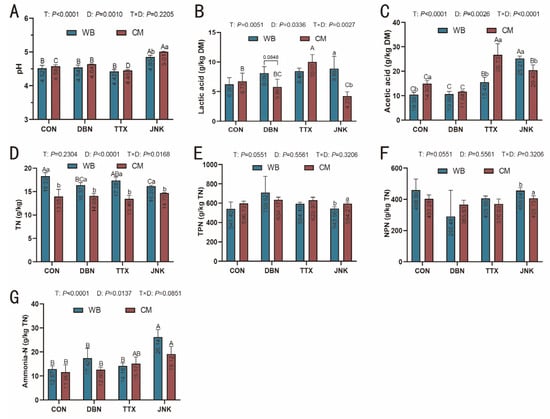 (A) pH; (B) Lactic acid; (C) Acetic acid; (D) Total nitrogen (TN); (E) True-protein nitrogen (TPN); (F) Nonprotein nitrogen (NPN); (G) Ammonia-N in peanut vine co-silage with wheat bran or corn meal, respectively. T: the influence of inoculant; D: the influence of silage substrate; T × D: the interaction between the inoculant and silage substrate. The significant difference (p < 0.05) between the different inoculant treatments (T) on the same silage raw substrate is represented by the different capital letters (A–D). The significant difference (p < 0.05) between the different silage raw substrates on the same inoculant treatment is represented by the different lowercase letters (a–b).