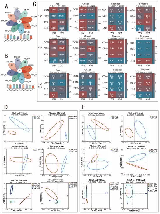 (A) Venn analysis of the operational taxonomic units (OTUs) for bacteriome in peanut vine co-silage with WB and CM addition of inoculants. (B) Venn analysis of the operational taxonomic units (OTUs) for mycobiome in peanut vine co-silage with WB and CM addition of inoculants. (C) Alpha diversity indices of bacteriome and mycobiome, and the 16S/ITS Ace estimator, Chao1 estimator, Shannon diversity index, and Simpson diversity index ratios. The data are expressed as mean. (D) Bacteriome and (E) mycobiome community dissimilarities in peanut vine co-silage with wheat bran or corn meal, respectively, were calculated using principal coordinates analysis (PCoA), respectively.. WB: wheat bran; CM: corn meal. The significant difference (p < 0.05) between the different inoculant treatments on the same silage raw substrate is represented by the different capital letters (A–C). The significant difference (p < 0.05) between the different silage raw substrates on the same inoculant treatment is represented by the different lowercase letters (a–b).