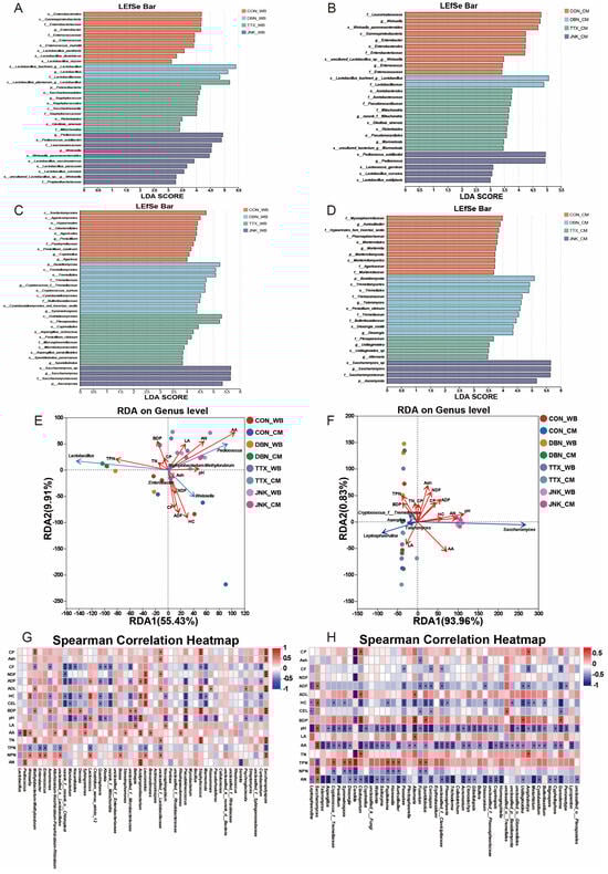 (A,C) LEfSe analysis of bacteriome and mycobiome for PV-WB silage and (B,D) PV-CM silage. (E) Redundancy analysis of environmental factors with bacteriome and (F) mycobiome sequencing data at genus level. (G) Correlation analysis between bacteriome composition and silage chemical composition and silage fermentation indicators. (H) Correlation analysis between mycobiome composition and silage chemical composition and fermentation indicators. WB: wheat bran; CM: corn meal; CP: crude protein; CF: crude fiber; NDF: neutral detergent fiber; ADF: acid detergent fiber; ADL: acid detergent lignin; HC: Hemicellulose; CEL: Cellulose; BDP: biodegradation potential; LA: lactic acid; AA: acetic acid; TN: total nitrogen; TPN: true-protein nitrogen; NPN: nonprotein nitrogen; *, ** and *** means p < 0.05, p < 0.01 and p < 0.001, respectively.