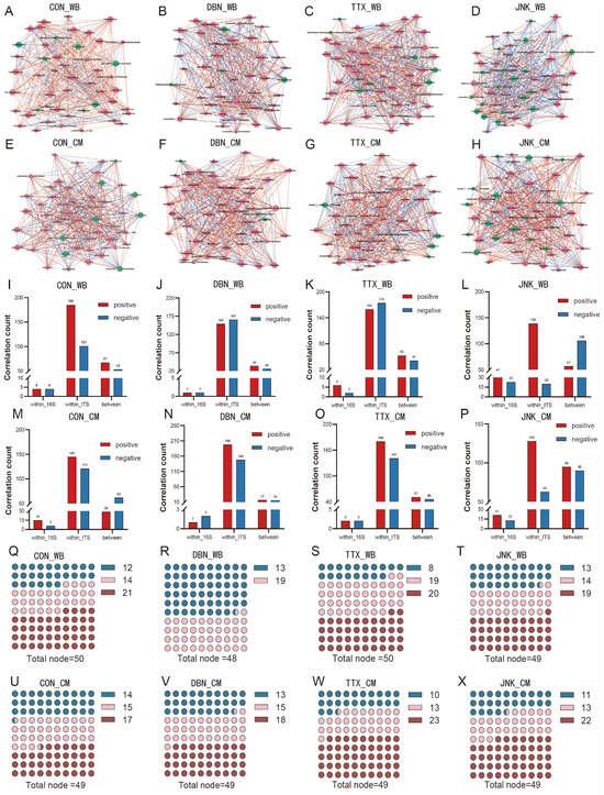 Co-occurrence network based on Spearman analysis showing the correlation among bacteria–bacteria, fungi–fungi, and bacteria–fungi (A–H). Counts of interactions analyzed by Spearman analysis within the bacteriome and mycobiome, and between bacteriome and mycobiome based on the genus level (I–P). The node degree value that corresponds to the node size, and degree distribution proportions for each silage sample (Q–X). The node size reflects the connective degree of each node; the green node represents bacteria; and the red node represents fungi. The red edge represents a positive correlation, and the blue edge represents a negative correlation. WB: wheat bran; CM: corn meal.