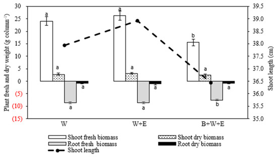 Root and shoot biomass values and shoot lengths of the wheat plants in different treatments. W: only wheat. W + E: wheat + earthworm. B + W + E: biochar + wheat + earthworm. The same letters indicate no significant difference between treatments for the same parameter. Mean ± standard deviation (n = 3).