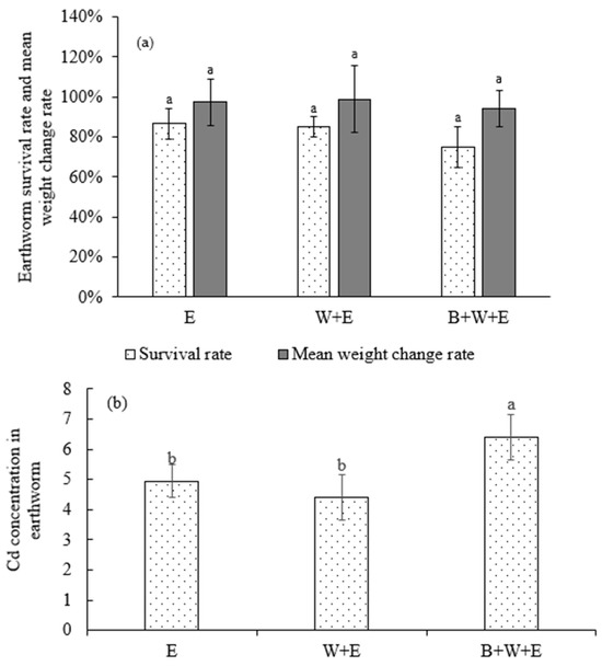 As shown in Figure 6a, the earthworm survival rate (75%) and mean weight change rate (94%) in B + W + E were lower than those in E (87% and 97%, respectively) and W + E (85% and 99%, respectively). The earthworm Cd concentration in B + W + E was 30% and 45%, which was significantly higher than those in E and W + E, respectively (Figure 6b). These results showed that wheat cultivation on the Cd-contaminated soil decreased the Cd concentration in earthworms, whereas biochar application increased the Cd concentration in earthworms, which posed a threat to earthworm survival.