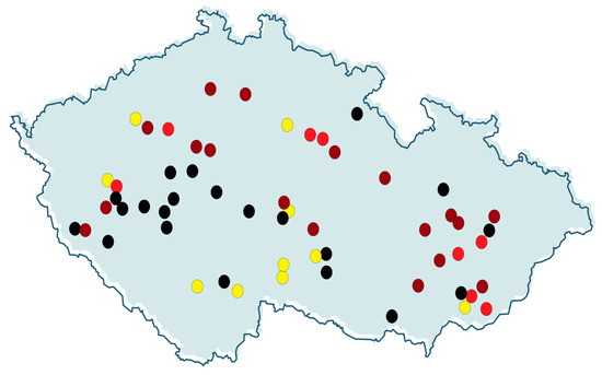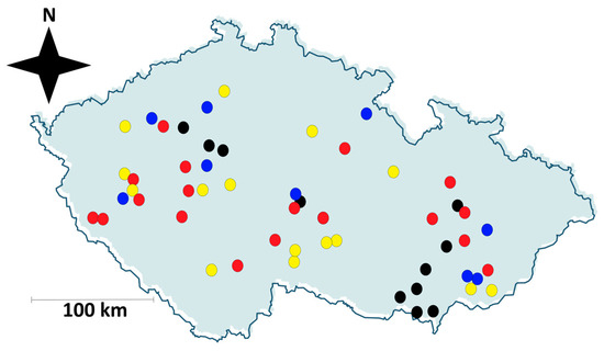 Monitored locations distribution in the Czech Republic with colour differentiation of soil type: chenozem—black, luvisol—red, fluvisol—blue, and cambisol—yellow.
