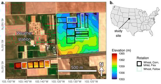 The management units in this study were located at the USDA-ARS Central Great Plains Research Station (40.155° N, 103.135° W) located 6.4 km east of Akron, Colorado (Figure 1b). The management units occur in two distinct clusters separated by approximately 300 m (Figure 1a). Across all management units, elevation ranged from 1353 to 1365 m, and slopes were below 4%. Soils included Ascalon sandy loam (fine-loamy, mixed, superactive, mesic Aridic Argiustolls), Platner loam (fine, smectitic, mesic Aridic Paleustolls), Rago silt loam (fine, smectitic, mesic Pachic Argiustolls), and Weld silt loam (fine, smectitic, mesic Aridic Argiustolls) [39,40].
