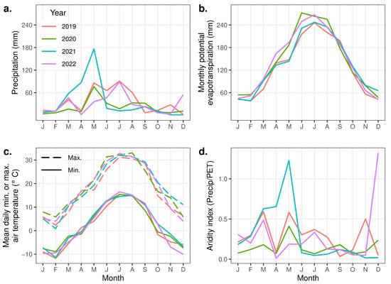 Weather conditions at the study site during the study period. Cumulative monthly precipitation (a), Penman–Monteith monthly potential evapotranspiration (PET) (b), monthly mean daily maximum and minimum air temperature (c), and aridity index (d), calculated as cumulative precipitation divided by PET.