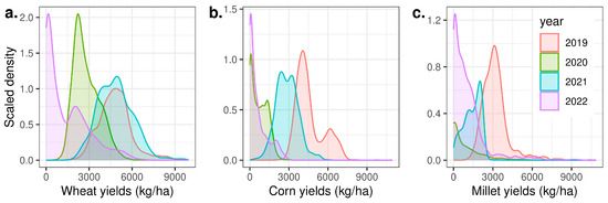 Distribution of processed yield values by year for wheat (a), corn (b), and millet (c). Curves represent kernel density estimates, scaled such that the area under the curve is proportional to the number of observations in each category for a given crop.