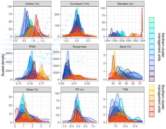 Distributions of soil properties and topographic data used for modeling for each management unit. Distributions for the southern cluster of units shown are shown in red hues. Distributions for the northern cluster of units are shown in blue hues. Curves represent kernel density estimates, scaled such that the area under the curve is proportional to the number of data points in each management unit.
