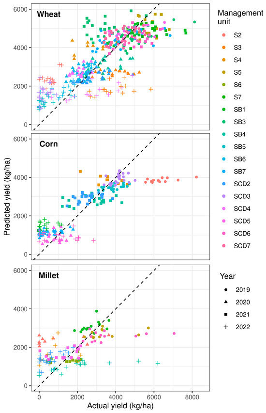 The random forest models’ out-of-bag errors (pseudo R2, estimated without spatial blocked cross-validation) were 0.86 for wheat, 0.91 for corn, and 0.58 for millet. The variance explained for testing data (r2) using a typical approach of random 10-fold cross-validation yielded similar model performance to that of training data, with r2 values averaging 0.87 for the wheat model, 0.91 for corn, and 0.60 for millet. However, when the models were tested, using spatially blocked cross-validation to reduce statistical dependence between training and testing data, model performance decreased substantially. The mean r2 was 0.25 for the wheat model, 0.21 for corn, and 0.19 for millet. Predicted versus actual yield values for the withheld block (i.e., management unit) from each cross-validation iteration are shown in Figure 5.