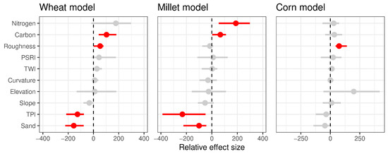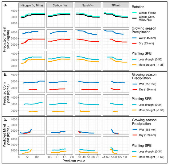 Permutation variable importance scores as measured by the percent-increase root mean squared error are shown in Table 4. The significant predictors of yield were the TPI, percent sand, and total soil carbon for the wheat and millet models; N application for the millet model only; and roughness for the wheat and corn models (Figure 6). The variables with the largest effect on yield for wheat and millet were the N application rate, TPI, percent sand, and total soil carbon.
