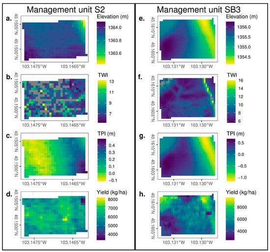 Maps of yield and select topographic attributes for two management units used in the study: unit “S2” (Panels (a–d)) and unit “SB3” (Panels (e–h)). Yield data shown are from 2019. Unit S2 was in the corn phase of the WCMFx rotation, and SB3 was in the wheat phase of the WF rotation. Gray pixels represent NA values caused by zero or near-zero slope values, which are outside the domain of the TWI function.