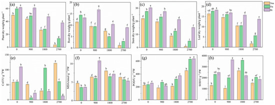 Effects of AMF on plant dry weight (a), root dry weight (b), stem dry weight (c), leaf dry weight (d), CAT activity (e), MDA content (f), POD activity (g), and SOD activity (h) under different Pb concentrations. Values are the means ± standard deviation (SD) (n = 3). Different letters in the same column indicate statistically significant differences (p < 0.05).