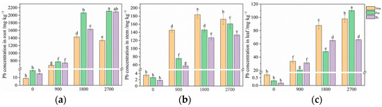 As the level of Pb supplementation increased, the Pb concentrations in the roots, stems, and leaves showed a consistent upward trend across all inoculated treatment conditions (Figure 2). Under the treatment with Fm, at the addition level of 2700 mg·kg−1, the Pb concentrations in the roots, stems, and leaves reached their maximum values of 2110.76, 160.97, and 110.46 mg·kg−1, respectively. Similarly, under the treatment with Ri, at the same addition level of 2700 mg·kg−1, the Pb concentrations in the roots, stems, and leaves peaked at 2090.56, 133.57, and 66.48 mg·kg−1, respectively. Notably, the Pb content in the roots and stems displayed a fluctuating pattern, characterized by a low–high–low trend as the Pb concentration increased under non-inoculation conditions, while the Pb content in the leaves exhibited a steady upward trend.